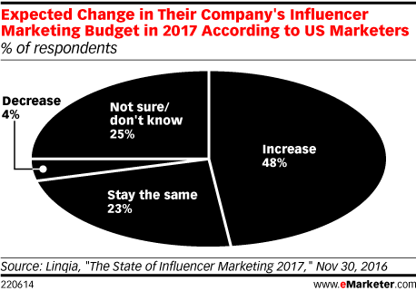 48 percent of brands stated in a recent poll that they would increase their influencer budgets in 2017. You might be asking why this is something to look out for. We’ve included it here because the recent increase in demand for authentic, original influencer content has led to an increase in cost.
