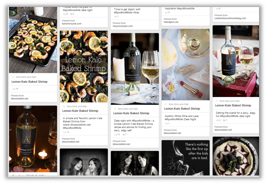 In the example below, we partnered with creators to develop content inspired by the new vintage of Apothic White - labeled a white with darker motives. Their beautiful content including recipes, party plans and tablescapes featuring the wine was aggregated on a collaborative pin board during the campaign. One year after the campaign ended, the content was repinned thousands more times and followers to the board as a whole grew 20% without a single dime being spent on new content or distribution.